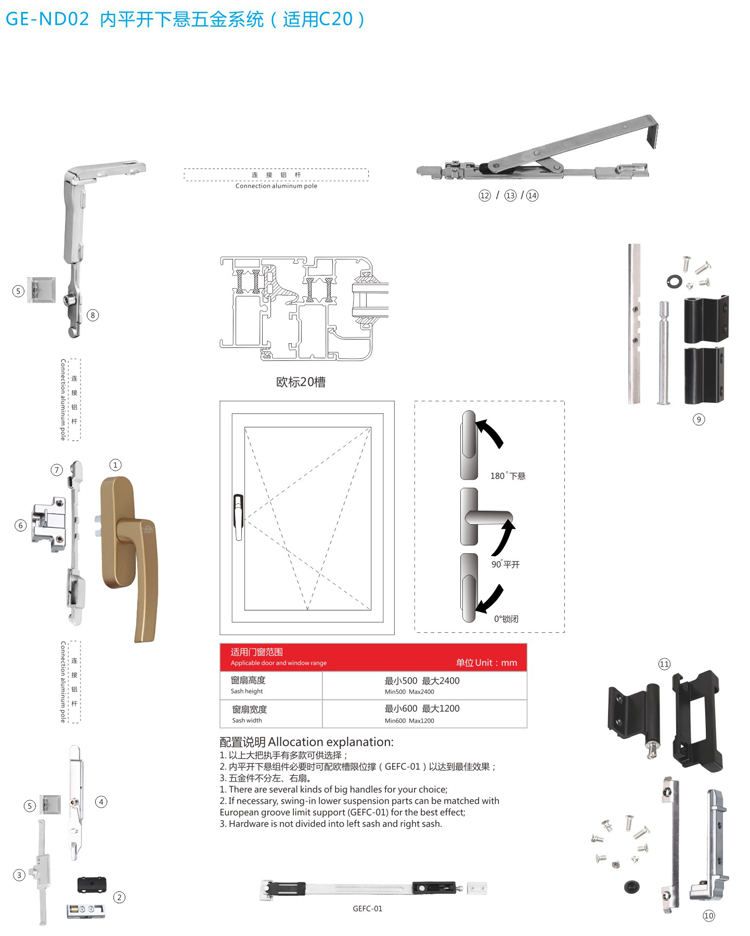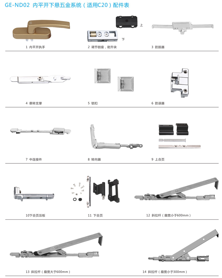 产品型号:GE-ND02 产品名称:内平开下悬五金系统(适用C20)